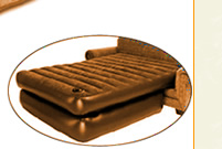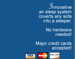 An innovative air bed mattress that turns any standard sofa (minimum 60" between the arms) into a queen size 60"x 80"x 20" high guest bed. This remarkable air bed mattress sets up, tears down and stores away in minutes.